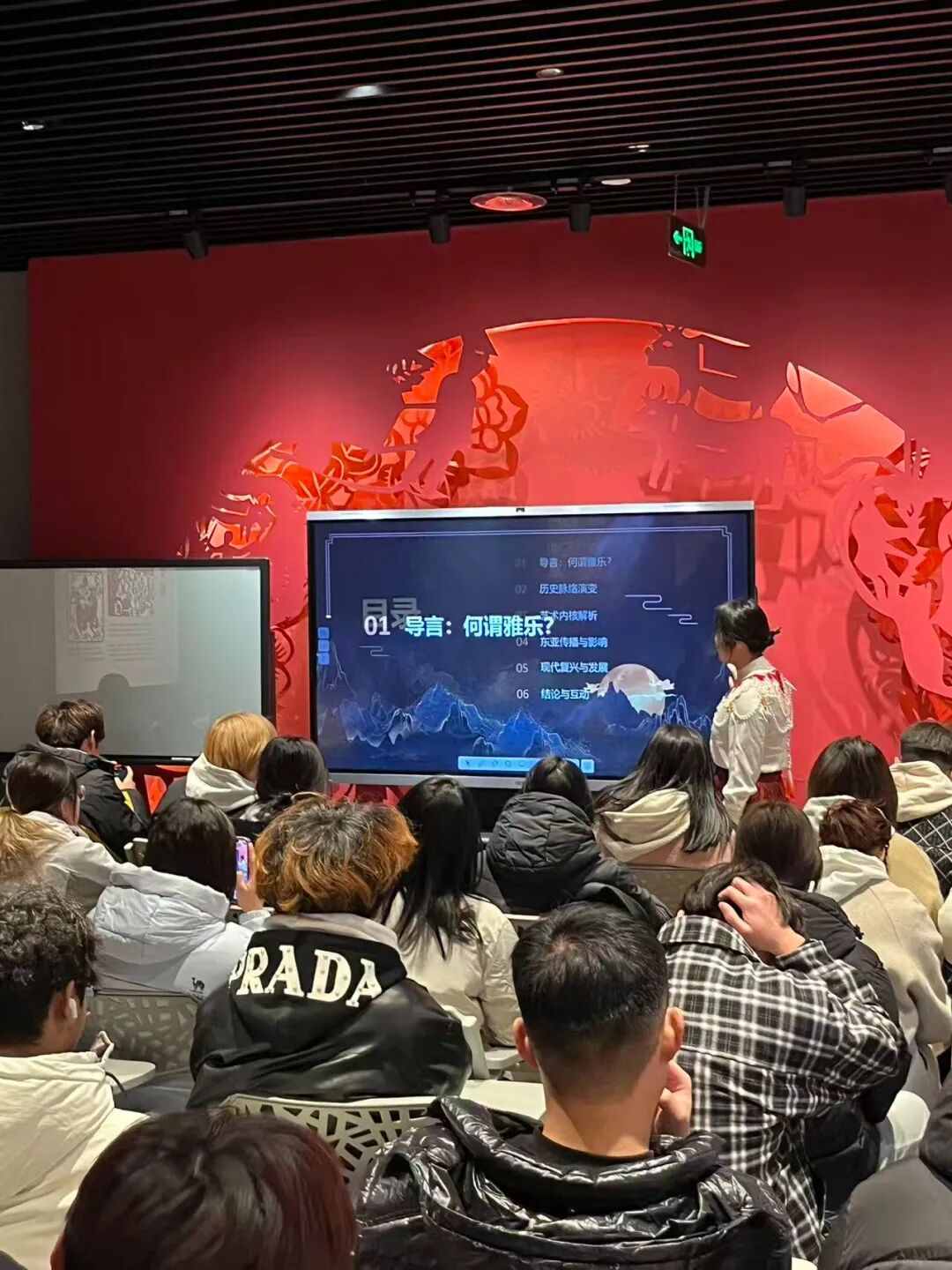 此次活动,邀请筑梦合唱团李瑞缘老师从雅乐起源、发展脉络、礼仪规范、代表曲目等方面展开讲解,结合大量的史料与案例分析不仅增强知识的广度与深度。同时赋予活动趣味性。